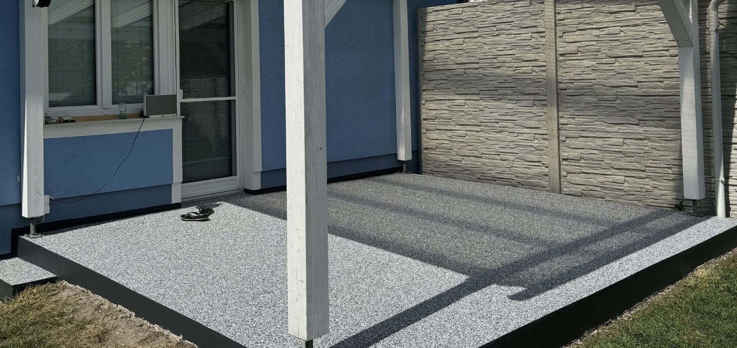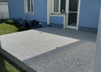 Der Boden ist rutschhemmend, witterungsbeständig und pflegeleicht und eignet sich ideal für Terrassen, überdachte Außenbereiche und Eingangsbereiche. Durch die nahtlose Verarbeitung entsteht eine langlebige Oberfläche, die sowohl funktional als auch optisch überzeugt.